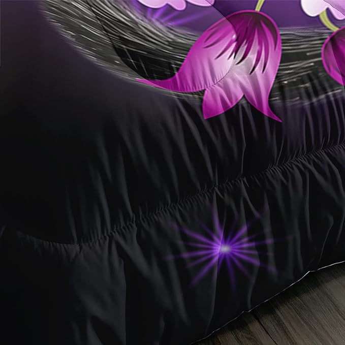 Black Cat Bedding Cartoon Cat Comforter Set Twin,Daisy Butterflies Printed Kids Bedding Set for Kids Boys Girls Adults Room Decor,Kids Comforter Set All Season,1 Quilt 2 Pillow Cases,Purple
