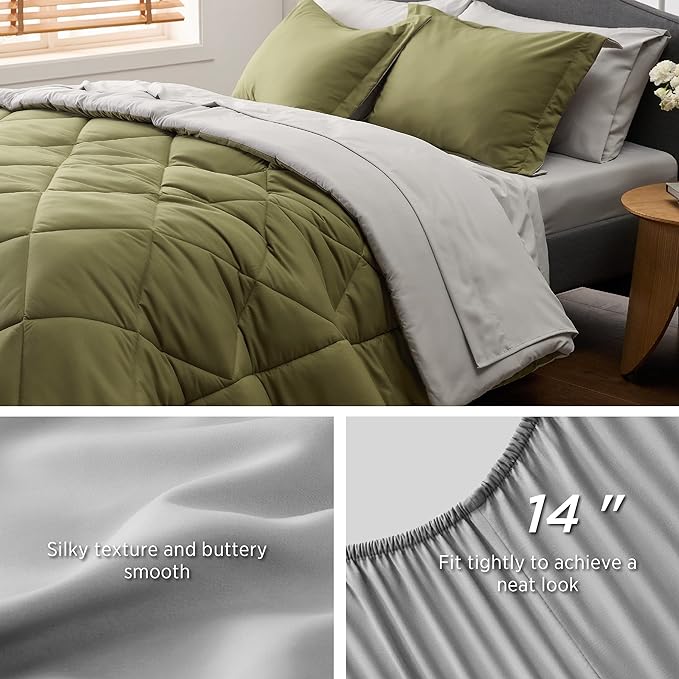 Bedsure Olive Green California King Size Comforter Set - 7 Pieces Reversible Cal Bed in a Bag Bed Set with Comforters, Sheets, Pillowcases & Shams, California King Bedding Sets