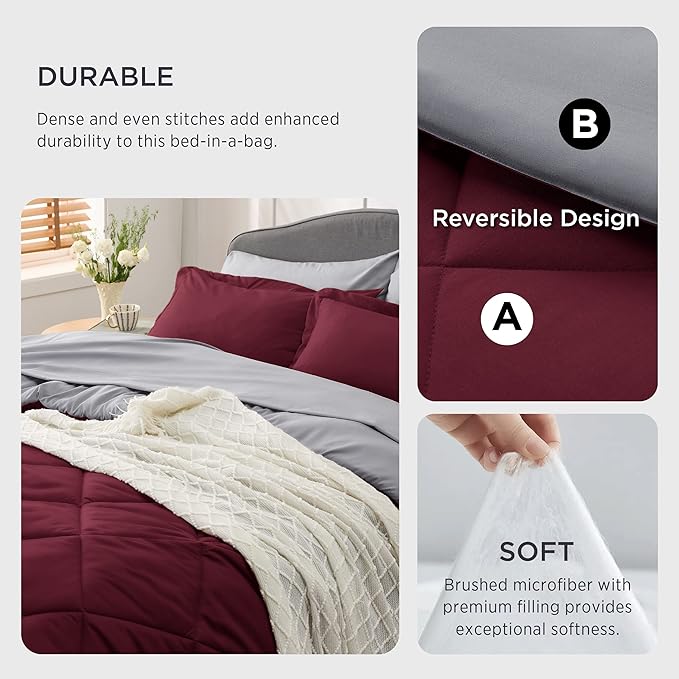Bedsure Burgundy California King Size Comforter Set - 7 Pieces Reversible Cal King Bed in a Bag Bed Set with Comforters, Sheets, Pillowcases & Shams, California King Bedding Sets