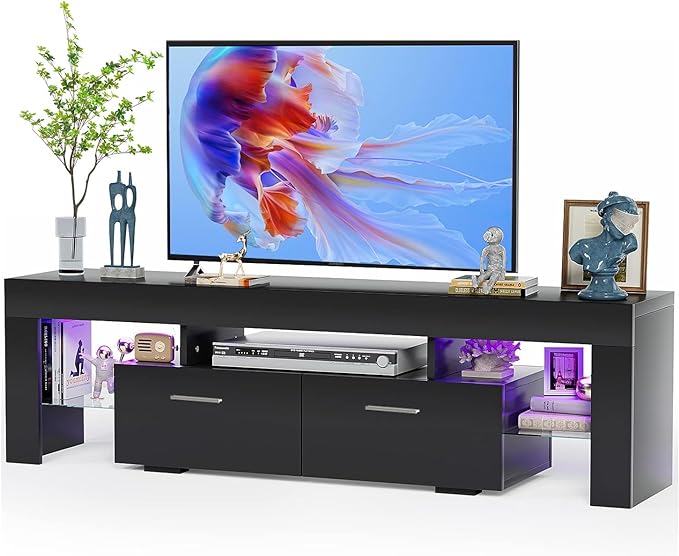 HOUAGI LED TV Stand for 50/55/60/65/70 Inch TVs,Modern Entertainment Center with Storage Drawer and Glass shelf, TV Console Table for Living room,Bedroom,Black
