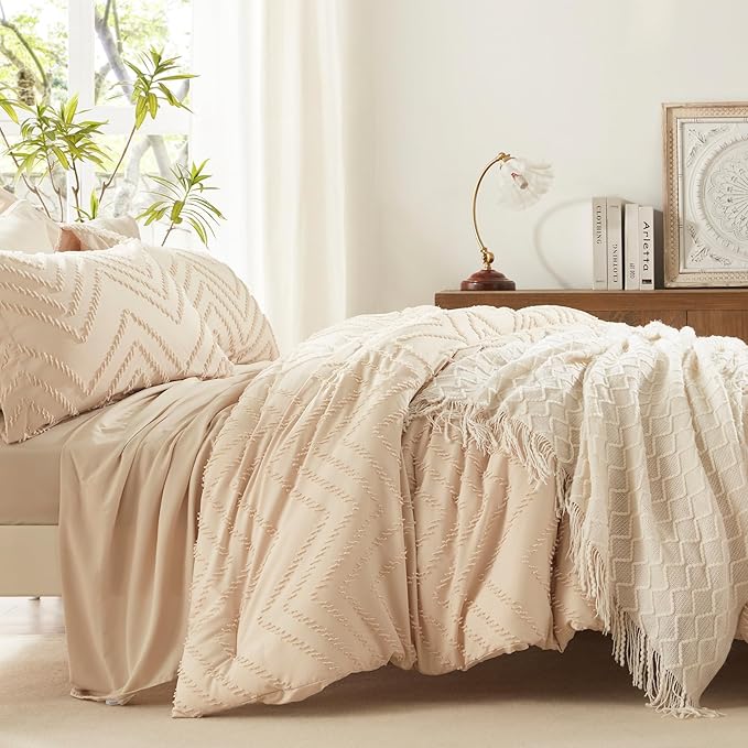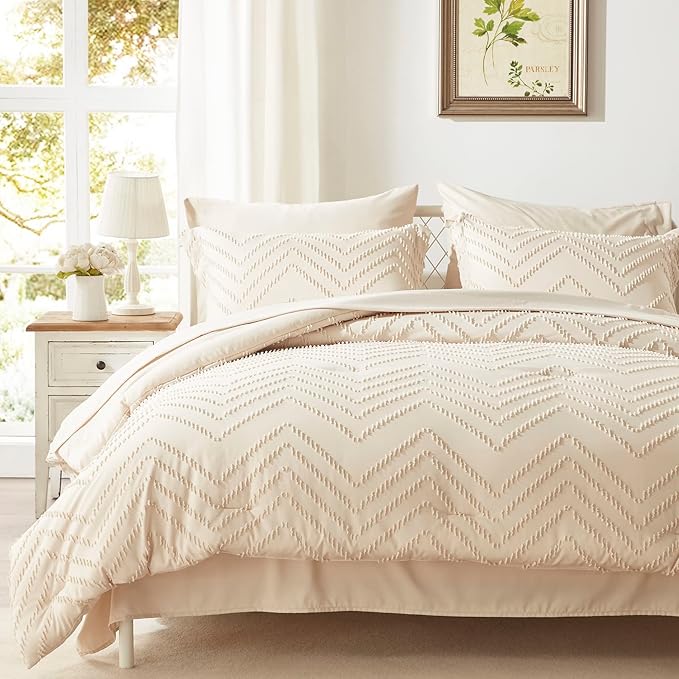 Anluoer King Bed in a Bag 7 Pieces, Beige Tufted Comforter Set with comforters and sheets, All Season Bedding Sets with 1 Comforter, 2 PillowShams, 2 Pillowcases, 1 Flat Sheet, 1 Fitted Sheet
