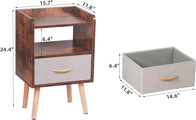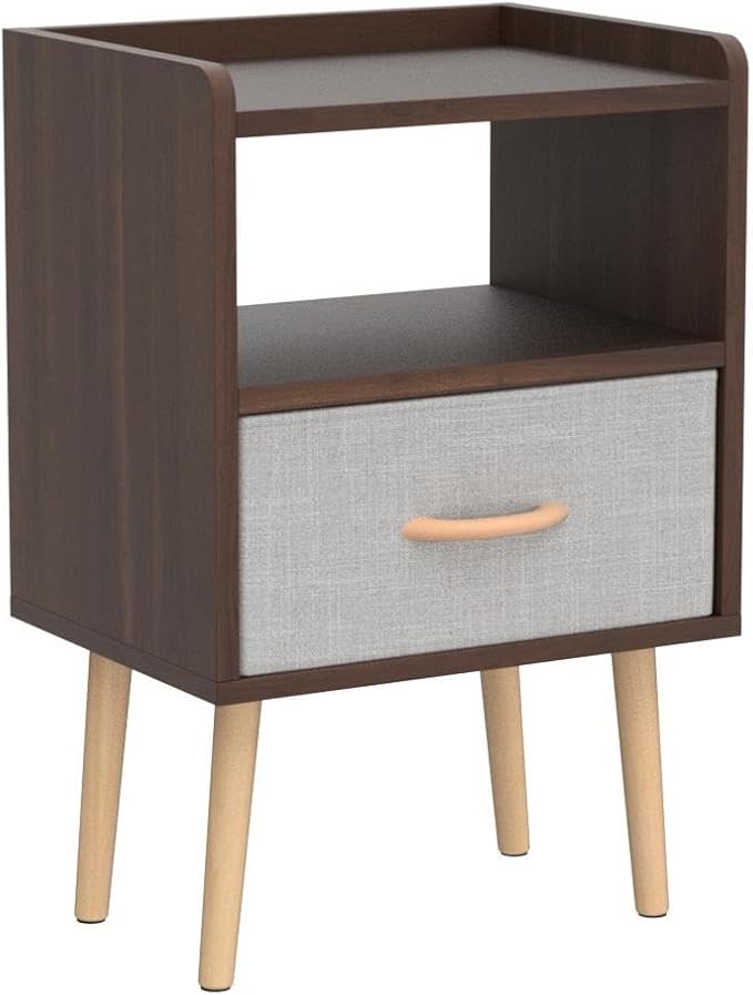LUCKNOCK NightStand with Fabric Drawer, Bedside Table with Solid Wood Legs, Minimalist and Practical End Side Table with Open Storage Shelf for Bedroom, Rustic Brown.