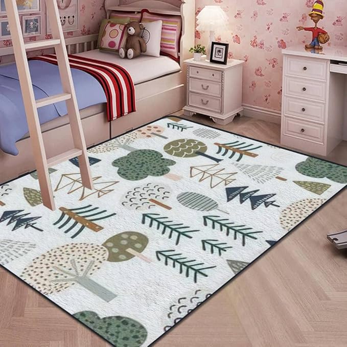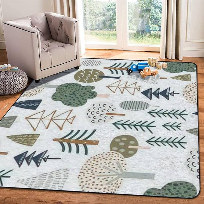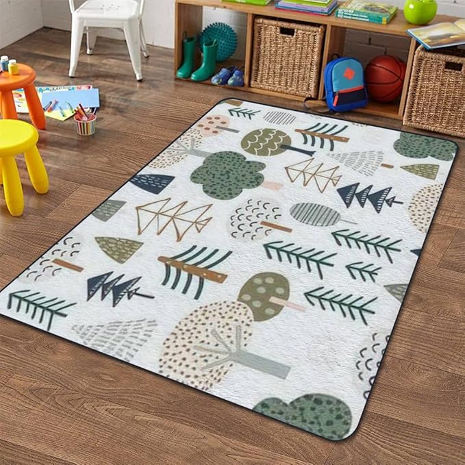Soft Kids Play Area Rugs 3D Home Woodland Seamless Trendy Forest Texture Abstract Hand Drawn Tree Plush Rugs Non Slip Shaggy Carpets for Kids' Bedroom Classroom Playroom Nursery Décor 5'x8'
