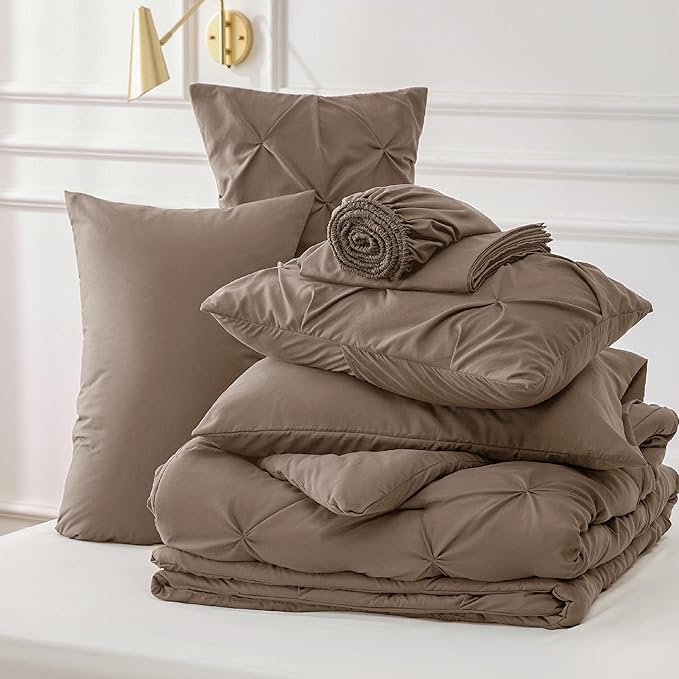 Bedsure Twin Size Comforter Sets Brown - 5 Pieces Pintuck Bed Set Twin Size, Twin Size Bed in a Bag with Comforter, Sheets, Pillowcase & Sham