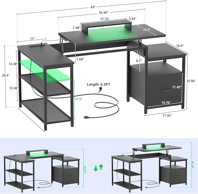 Aheaplus L Shaped Desk with Power Outlet, Standing Home Office Desk with Lift Top and File Drawer, 63'' Corner Computer Desk with Monitor Stand&Printer Shelves, Gaming Desk with Led Lights, Black