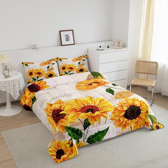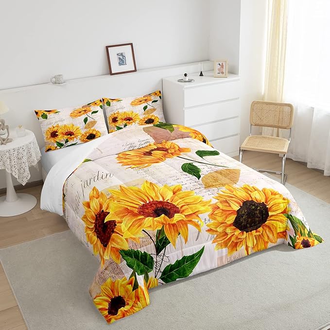 Girls Sunflowers Comforter Set Twin Size Retro Yellow Sunflower Bedding Set for Kids Teens Women Botanical Flowers Duvet Insert Vintage Floral Letters Down Comforter Kids Bedding Set, 2 Pieces