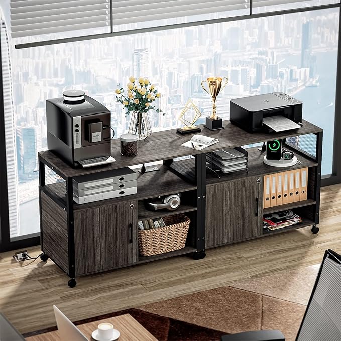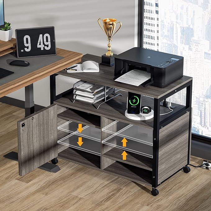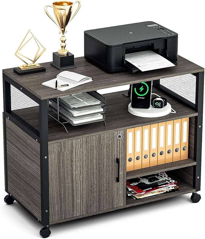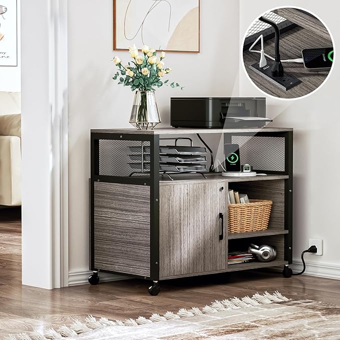 Lateral File Cabinets with Socket & USB Charging Station, Lockable Office File Cabinets Rolling Printer Stand with Open Storage Shelves for Home Office Organization & Storage