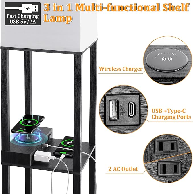 Dott Arts Floor Lamp with Shelves, Shelf Lamp with Wireless Charger & USB A+C Ports & 2 AC Outlets,3 Color Temperature Corner Tall Standing Floor Lamps for Living Room, Bedroom, Office (Black)