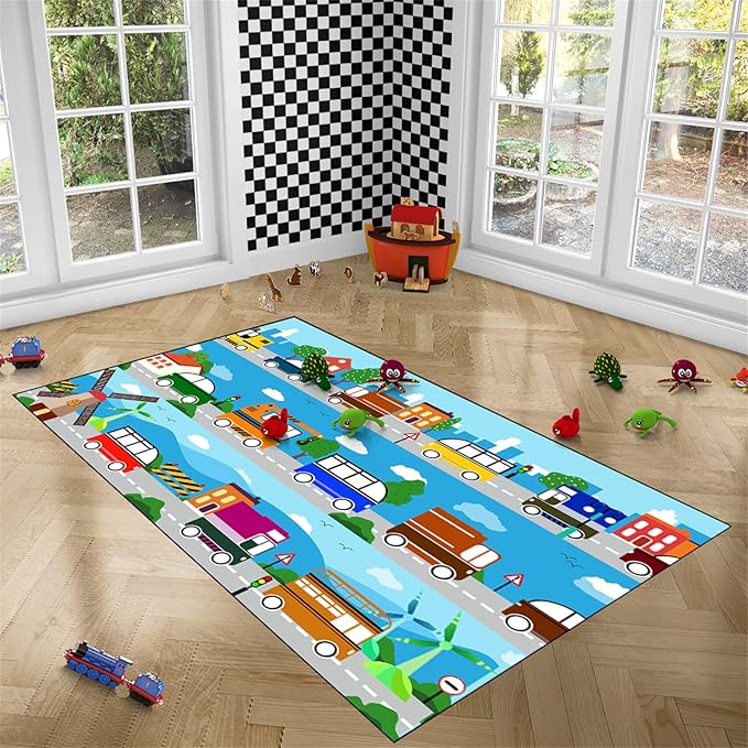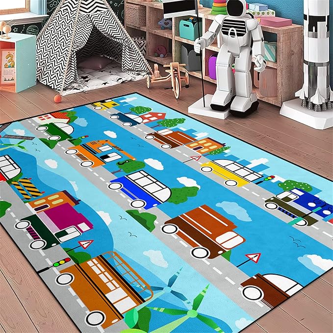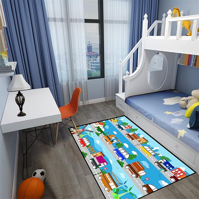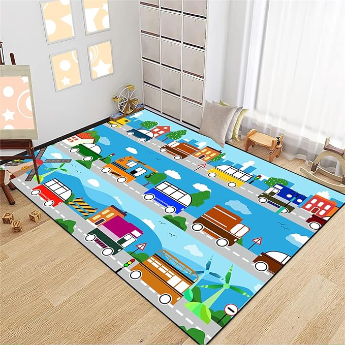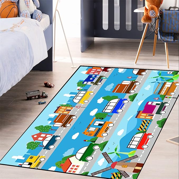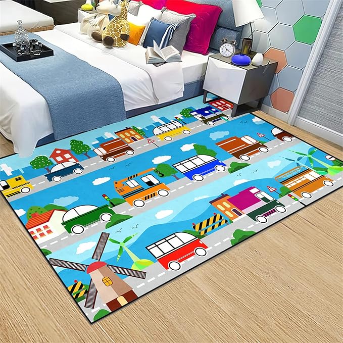About This Easy to Clean: car rugs for kids made from high-quality materials, construction decor for boys room rug is...