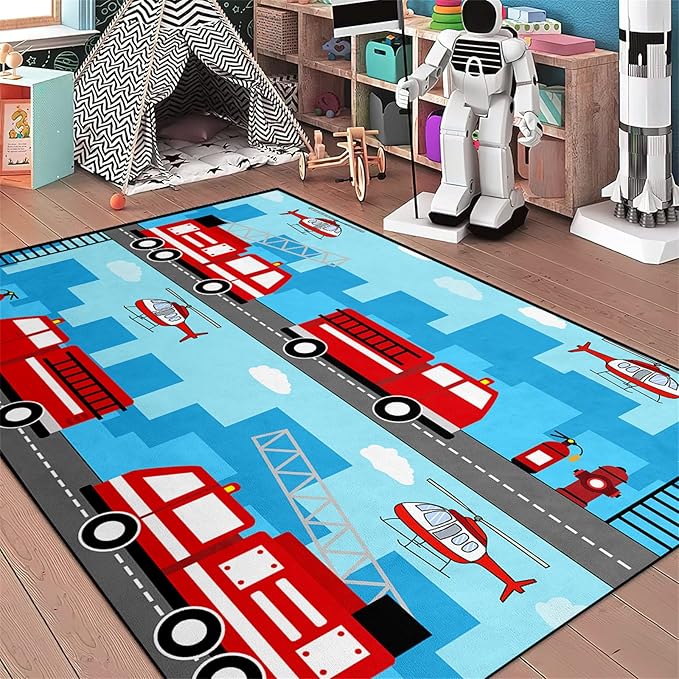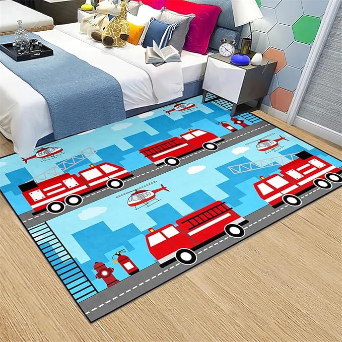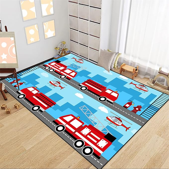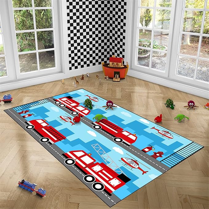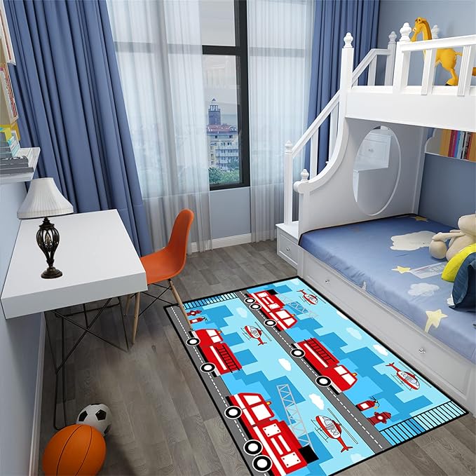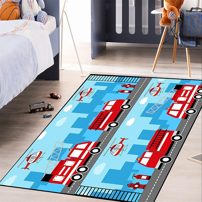 Car Rug Play Mat Car Rug Play Mat Car Rug for Boys Room Fire Fighting Truck Red Car Printed Rug Play Rug for Cars and Trucks Play Rugs for Kids Rooms,Light Blue 5'×7'