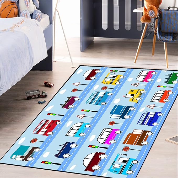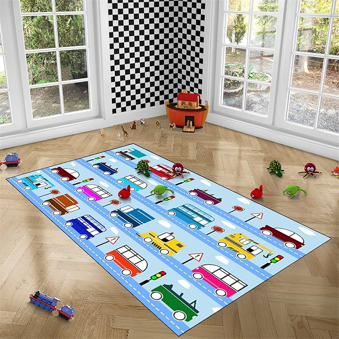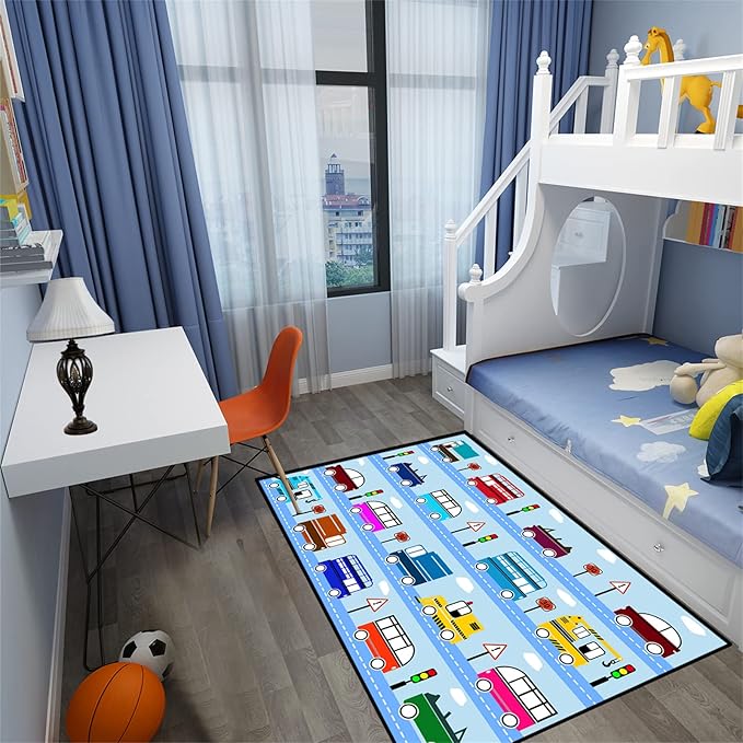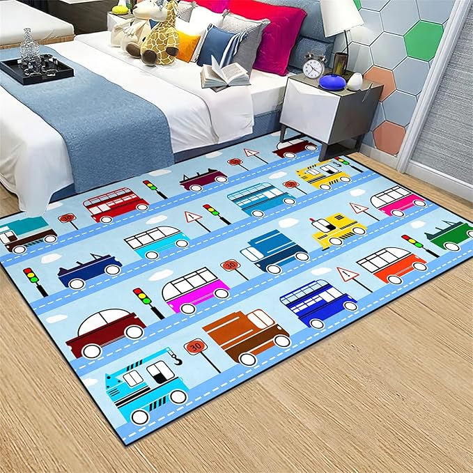 Car Rug Car Play Mat Kids Rugs for Playroom Car Rug Play Mat Rugs for Boys Bedroom Car Carpet for Kids Play Rug for Cars and Trucks Car Rug for Boys Room,Light Blue 5'×7'
