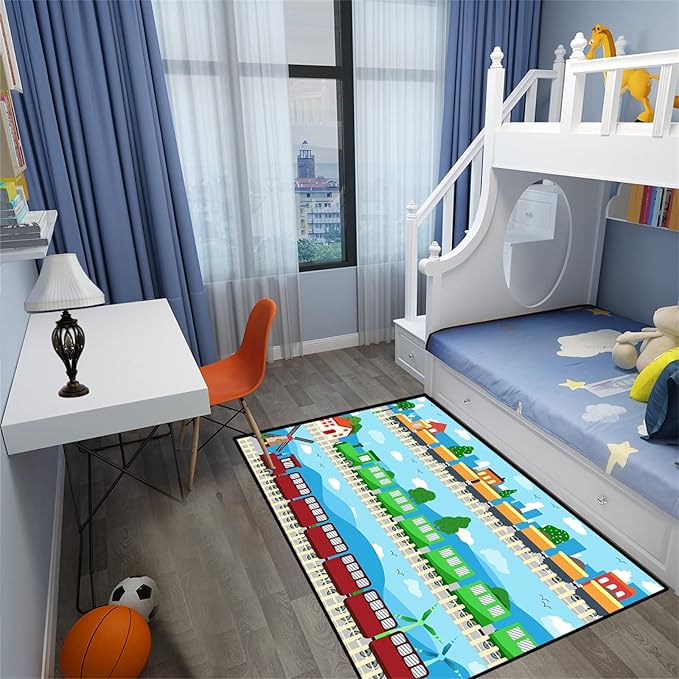 Train Rug Car Rug Play Mat Truck Rugs for Boys Room Kids Car Rug Truck Car Rug Car Carpet for Kids Kids Rugs for Playroom Car Rug for Boys Room,Light Blue 3'×4'