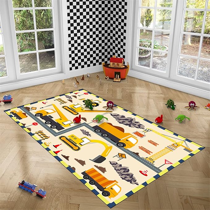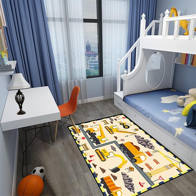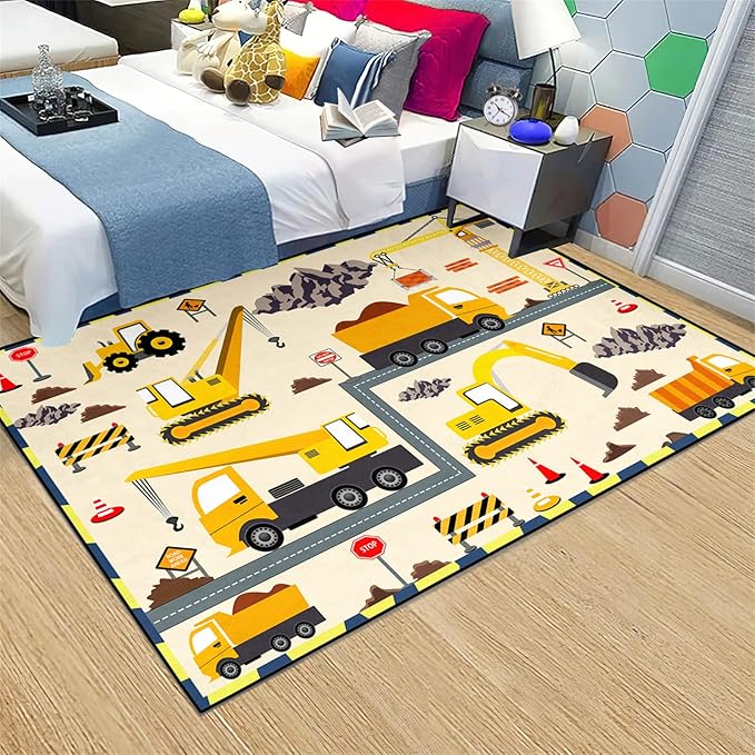 About This Easy to Clean: car rugs for kids made from high-quality materials, construction decor for boys room rug is...