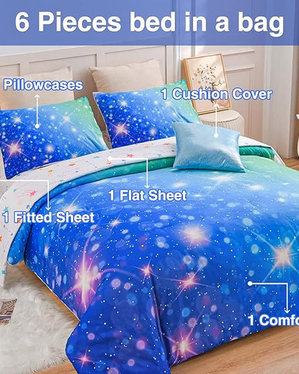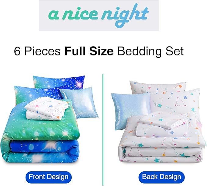 A Nice Night 6Pcs Gradient Glitter Bedding Set for Girls, Colorful Rainbow Galaxy Comforter Set, Ultra Soft Bedding Sets (Blue-Green,Full 6Pcs)