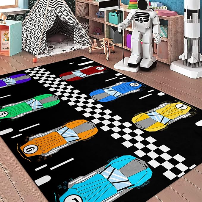 Race Car Rug Kids Play Area Rugs Race Car Track Rug Kids Rug with Roads and Tracks Car Track Carpet Car Rug for Boys Room Race Car Room Decor for Boys,Black 3'×5'
