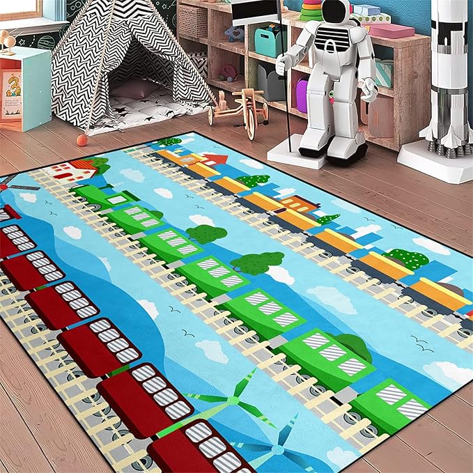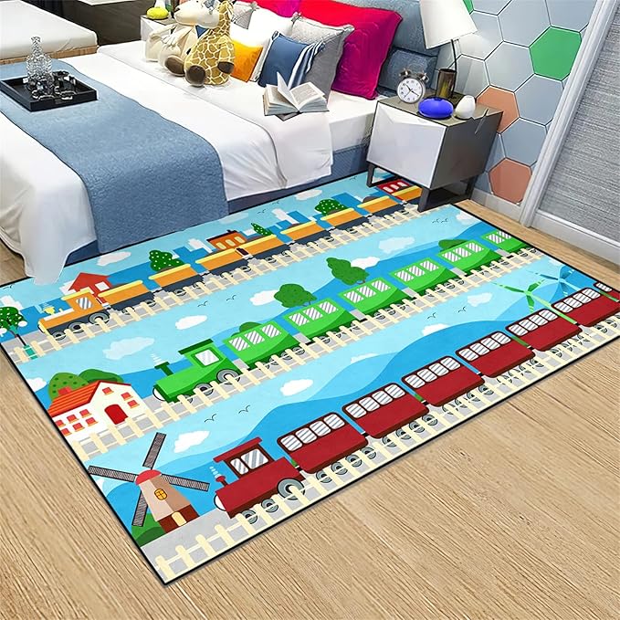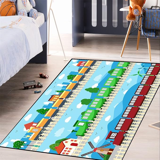 Train Rug Car Rug Play Mat Truck Rugs for Boys Room Kids Car Rug Truck Car Rug Car Carpet for Kids Kids Rugs for Playroom Car Rug for Boys Room,Light Blue 5'×7'