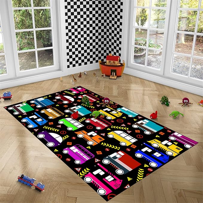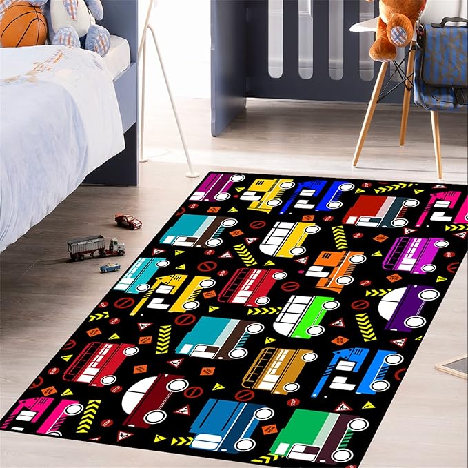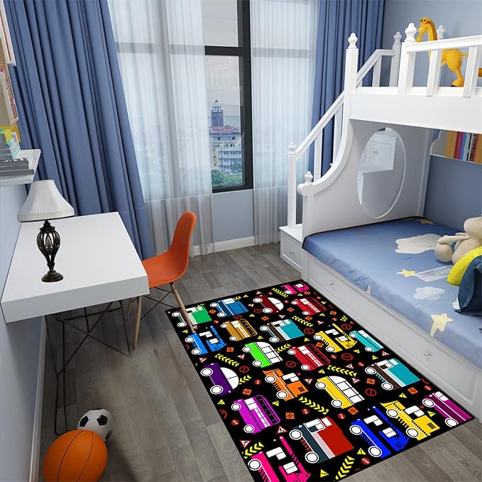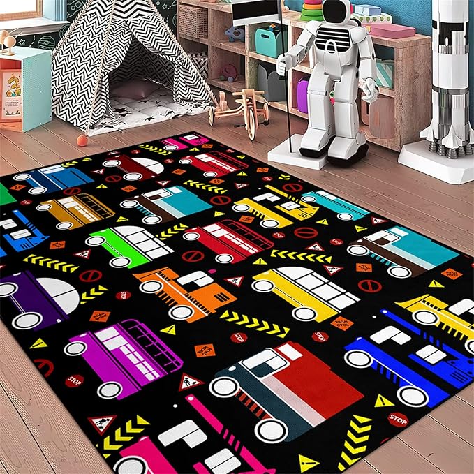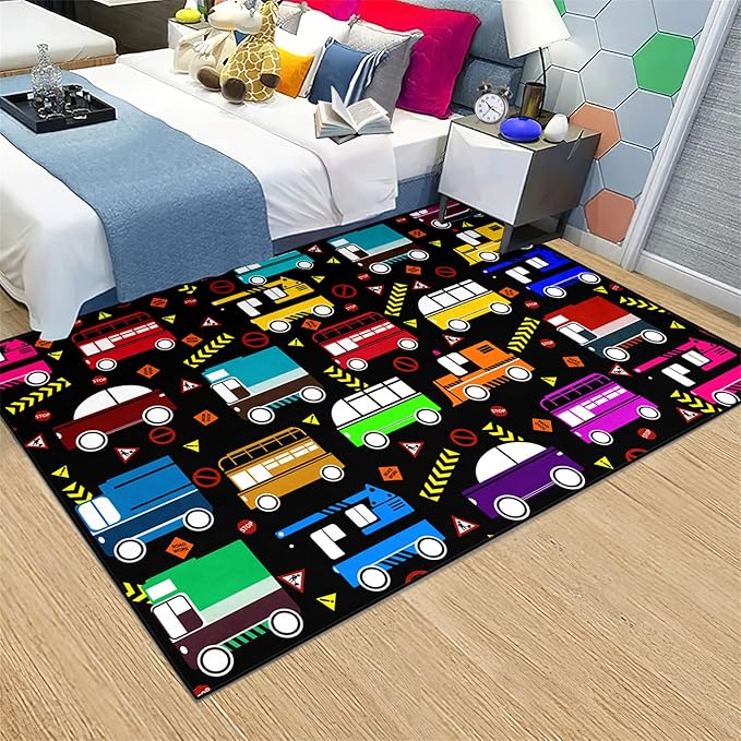 About This Easy to Clean: car rugs for kids made from high-quality materials, construction decor for boys room rug is...
