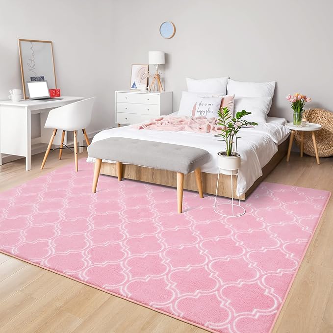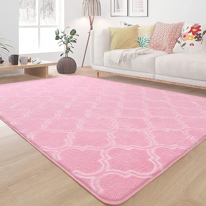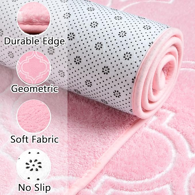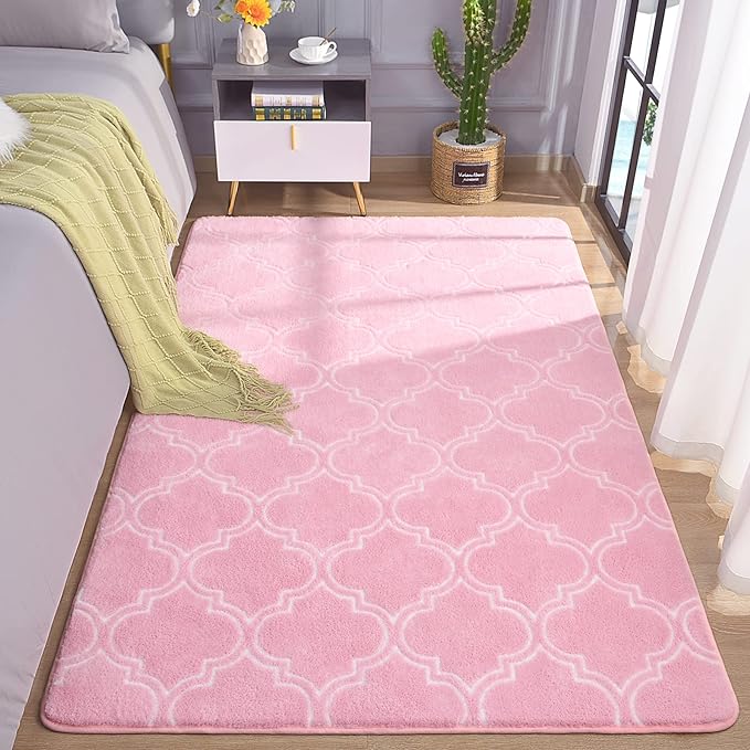 Chicrug Shag Geometric Modern Area Rug for Bedroom, 3x5 Feet Memory Foam Indoor Carpet, Fluffy Rug for Living Room Bedside Room Decor for Family Girls Kids Nursery Play Mat, Pink/White