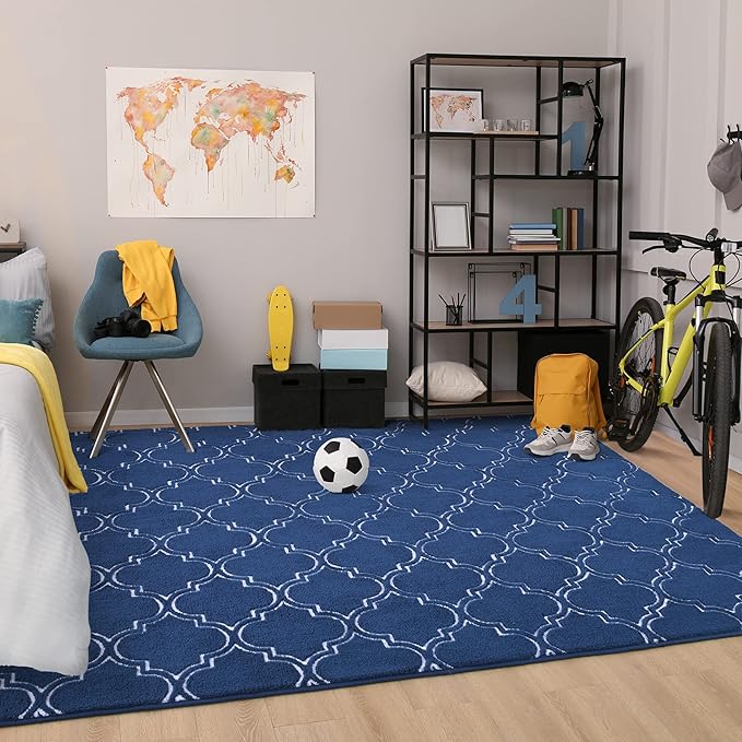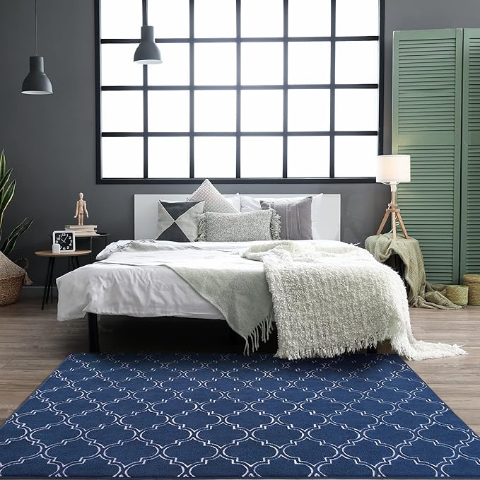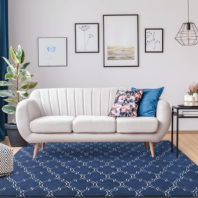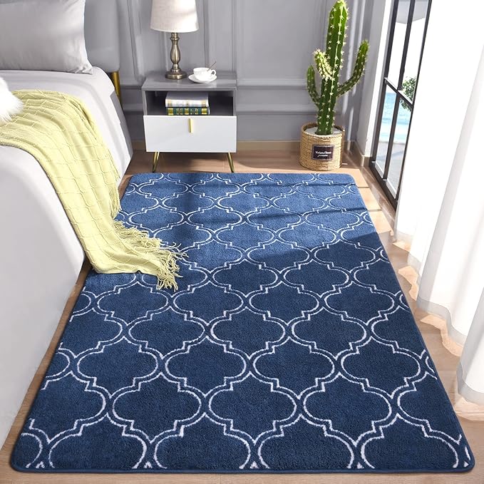 Chicrug Shag Geometric Modern Area Rug for Bedroom, 4x6 Feet Memory Foam Indoor Carpet, Fluffy Rug for Living Room Bedside Room Decor for Family Girls Kids Nursery Play Mat, Navy/White