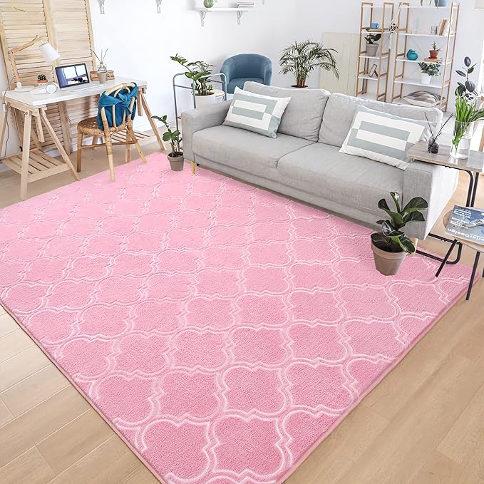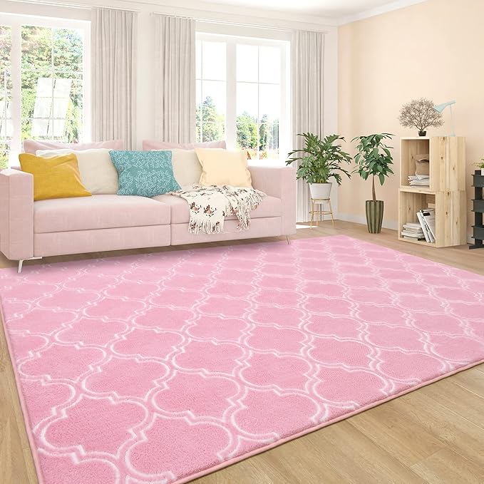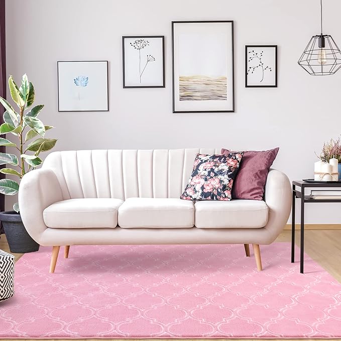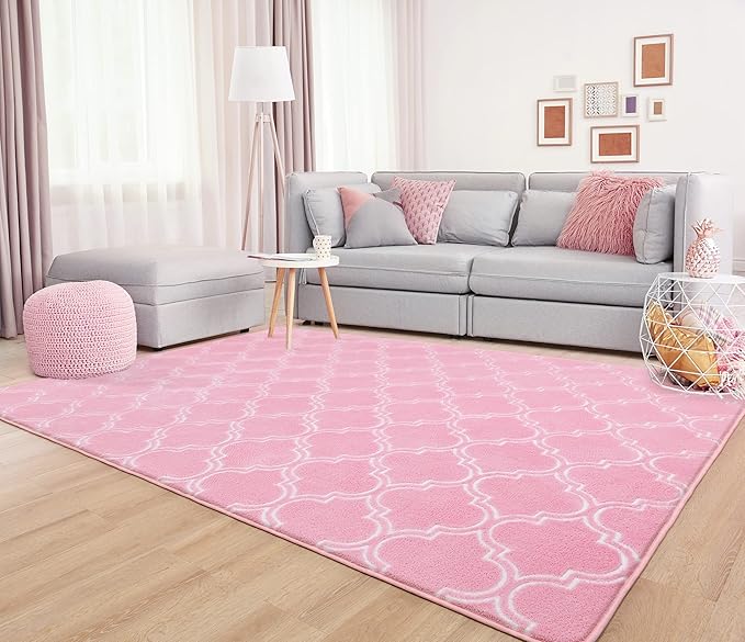 Chicrug Shag Geometric Modern Area Rug for Bedroom, 6x9 Feet Memory Foam Indoor Carpet, Fluffy Rug for Living Room Bedside Room Decor for Family Girls Kids Nursery Play Mat, Pink/White