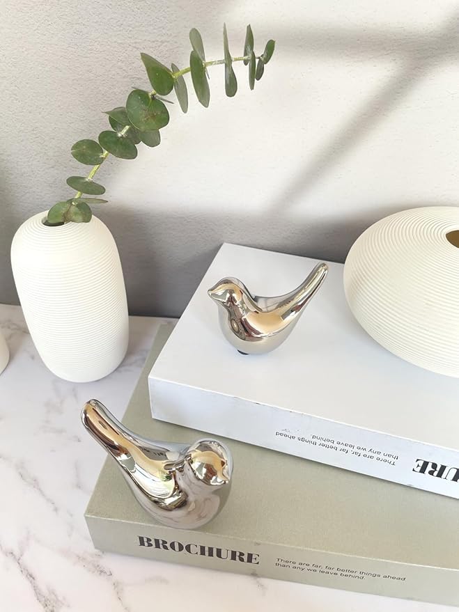 Cute Shelf Decor Birds, Small Animal Figurines Home Decor, Ceramic Silver Birds Shelf Decorations for Living Room Bedroom Bookshelf Table Top
