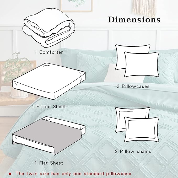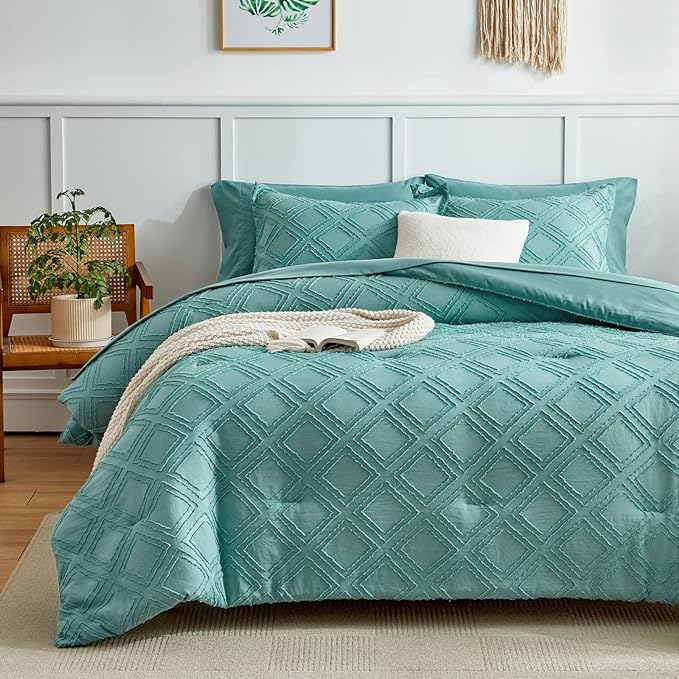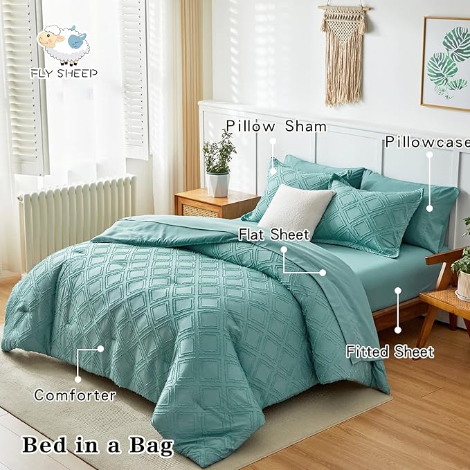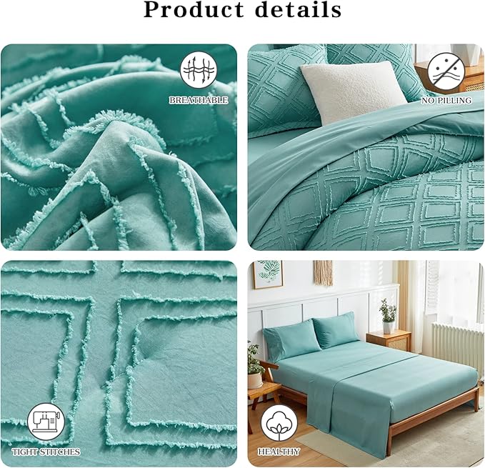 7 Pieces Tufted Bed in a Bag Queen Comforter Set with Sheets Green, Soft and Embroidery Shabby Chic Boho Bohemian, Luxury Solid Color with Diamond Pattern, Jacquard Tufts Bedding Set for All Season