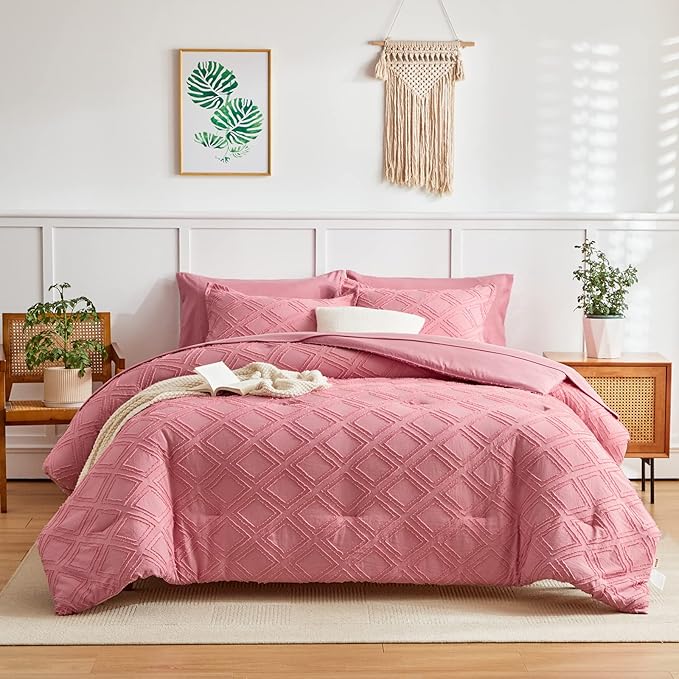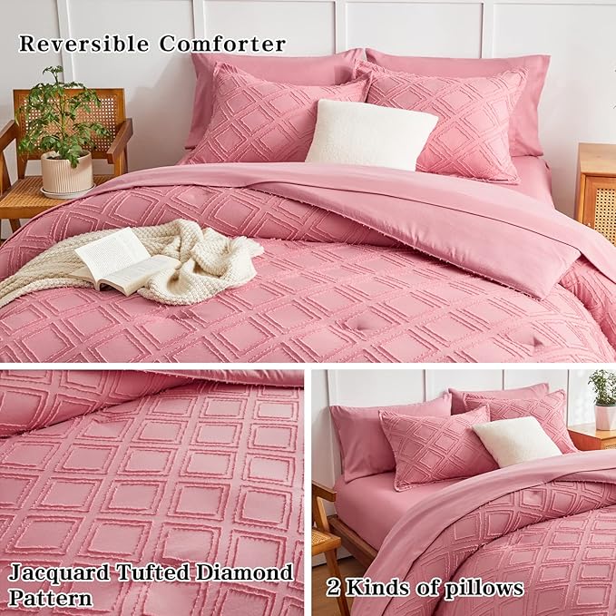 7 Pieces Tufted Bed in a Bag King Comforter Set with Sheets Pink, Soft and Embroidery Shabby Chic Boho Bohemian, Luxury Solid Color with Diamond Pattern, Jacquard Tufts Bedding Set for All Season