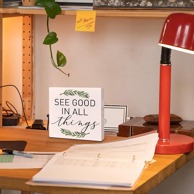 Home Office Desk Wooden Box Sign Decor, See Good in All Things, Inspirational Quotes Desk Decor Motivational Desk Decorations for Women Men Student Office Classroom School