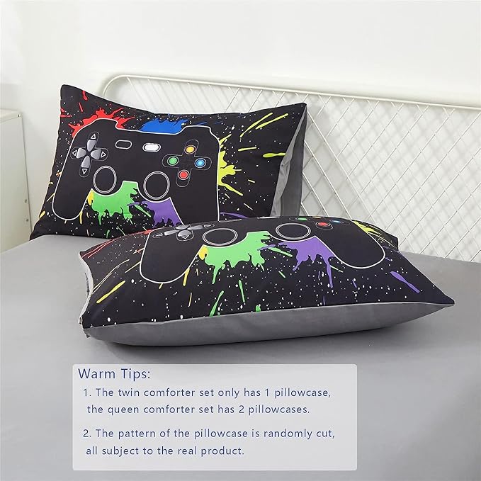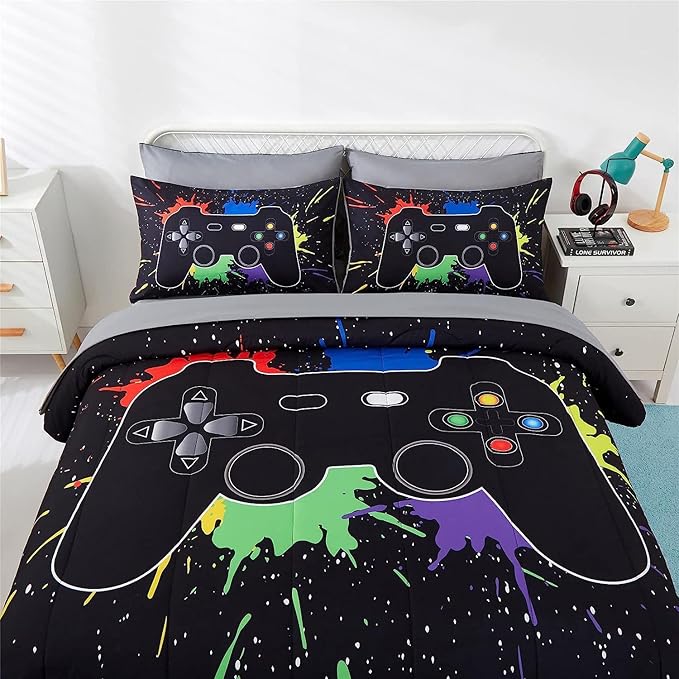 About This [Game Controller Design]: 3D video game controller comforter with rainbow splatter colors, making it a piece of artistic...