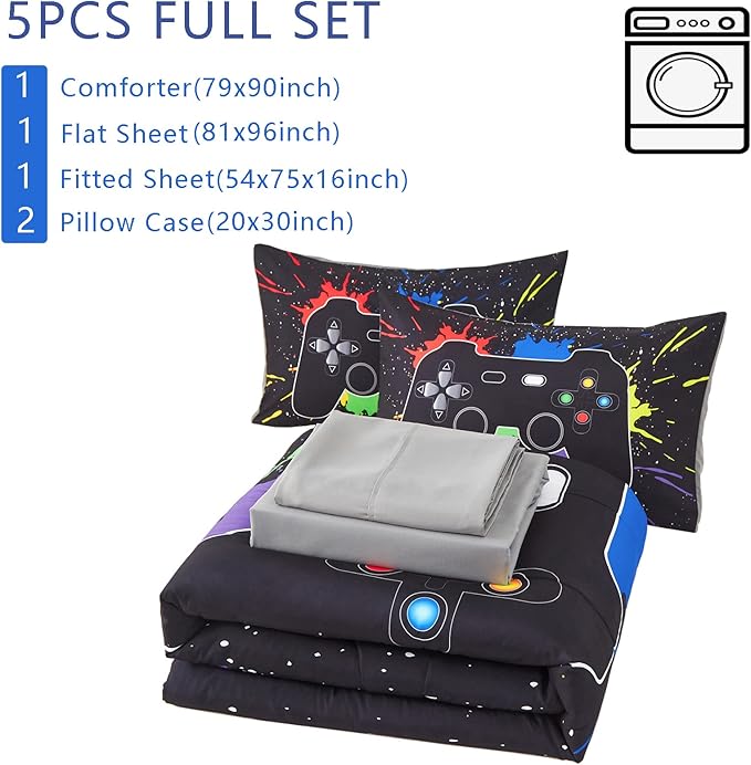 KAKKI 5 Piece Boys Full Gamer Comforter Set with Sheets, 3D Colorful Video Game Controller Comforter for Kids Teen, All Season Soft Microfiber Gaming Bedding Set(Black,Full)