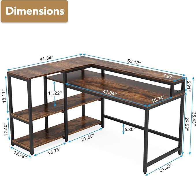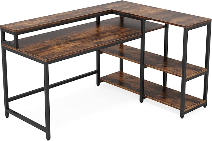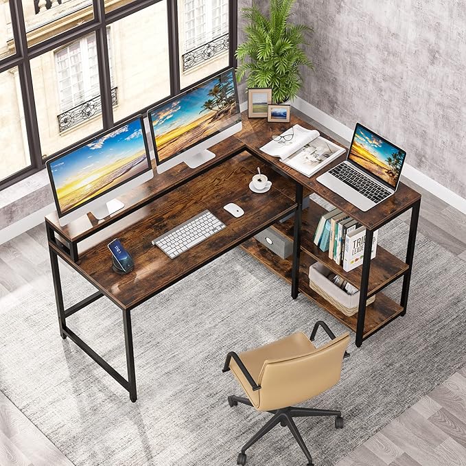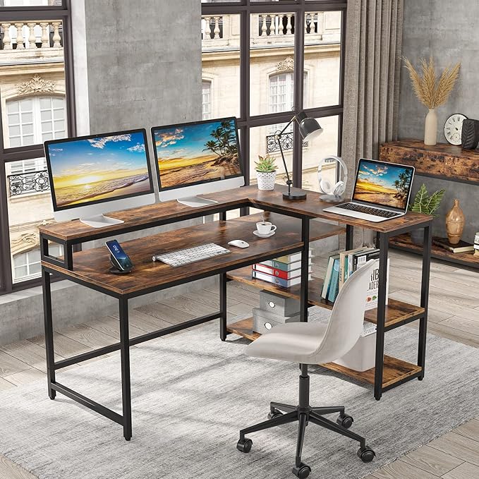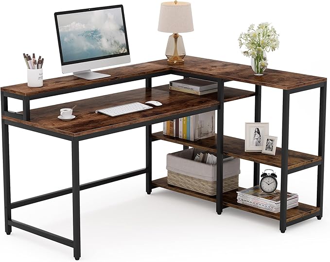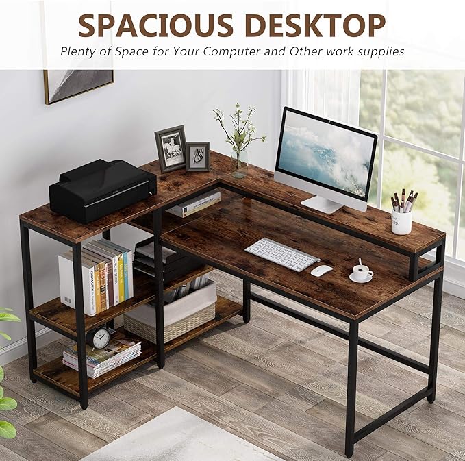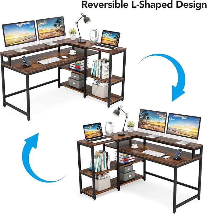 Reversible L Shaped Computer Desk with Storage Shelf, Industrial Corner Desk with Monitor Stand for Home Office