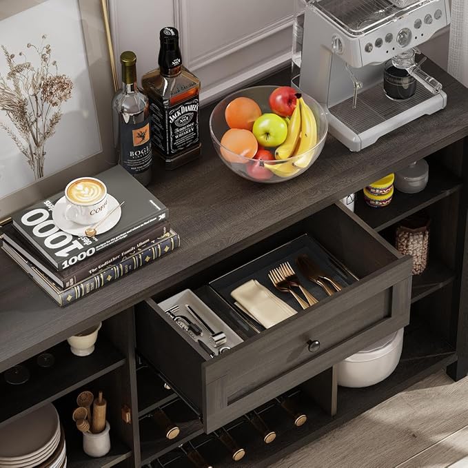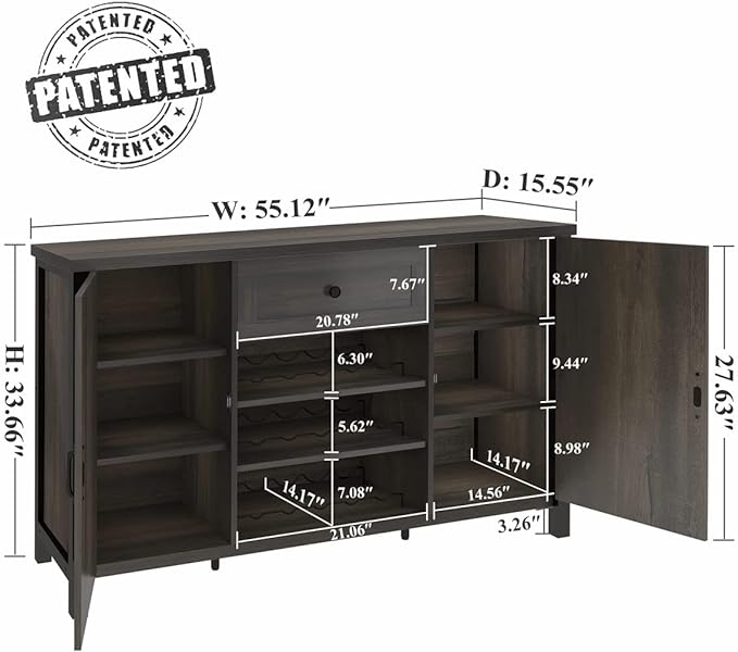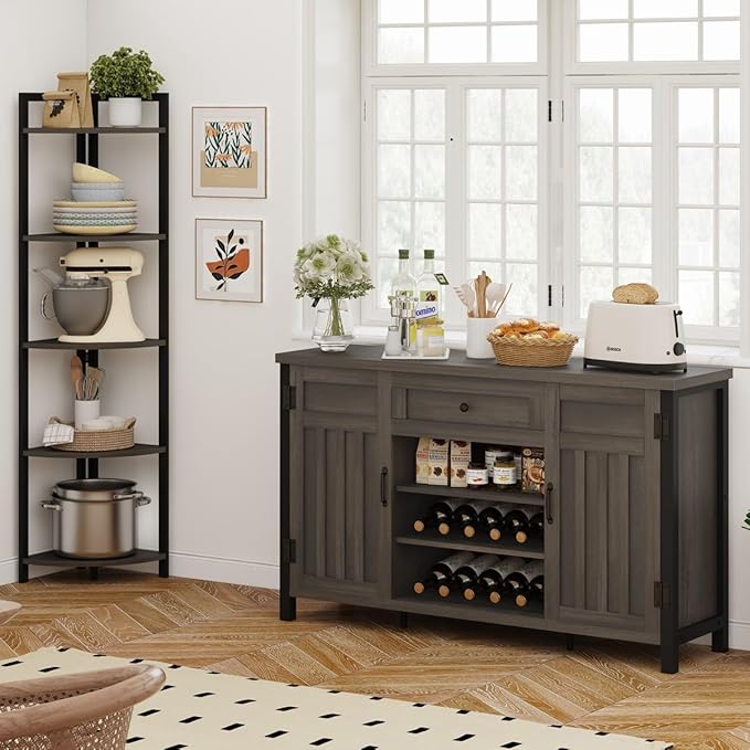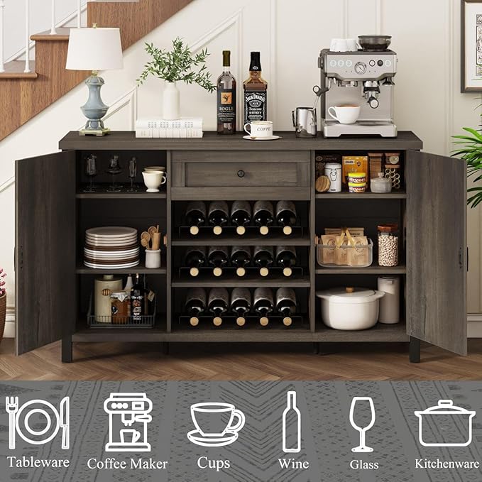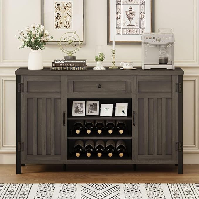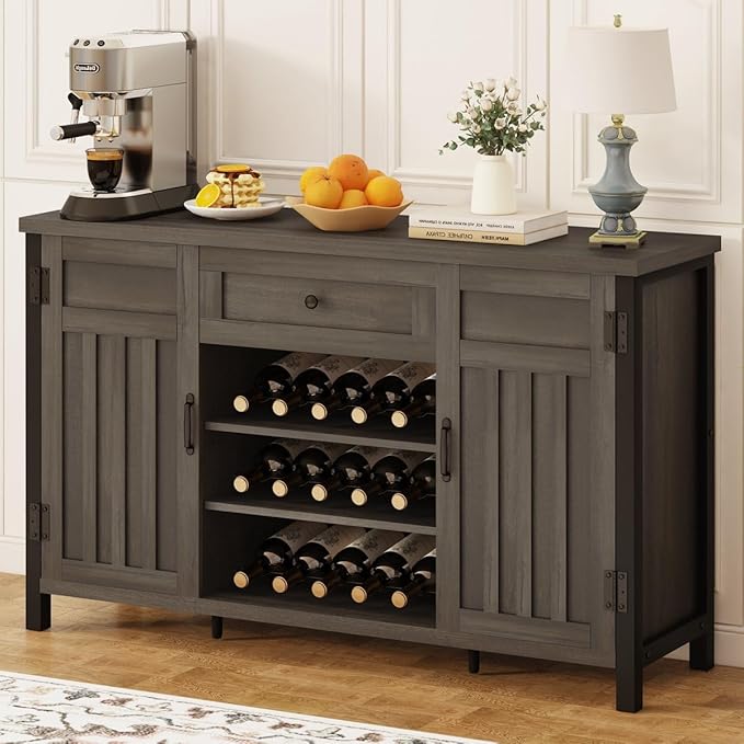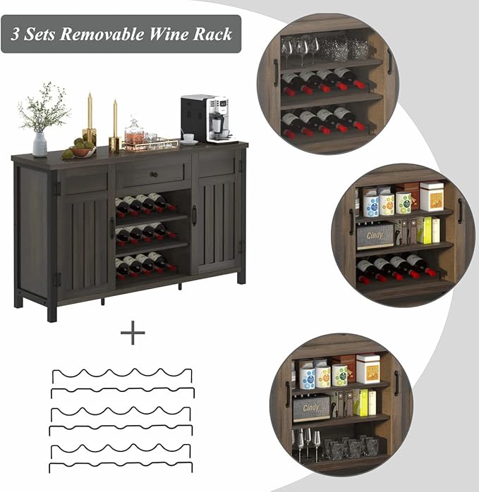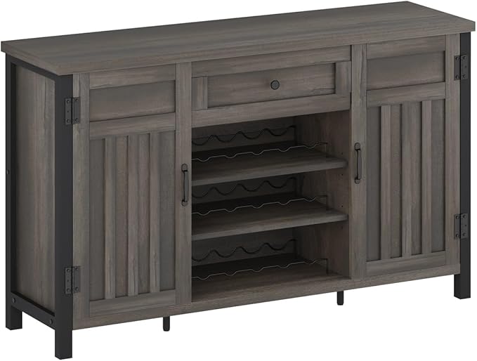 FATORRI Industrial Buffet Cabinet with Storage, Farmhouse Sideboard Cabinet with Wine Rack, Rustic Wood Coffee Bar Cabinet for Kitchen (55.12 Inch, Walnut Brown)