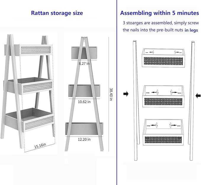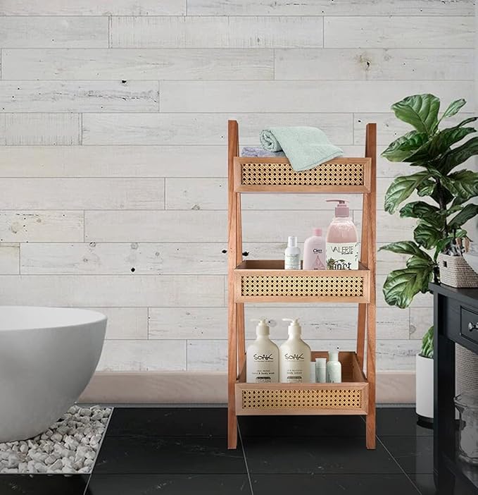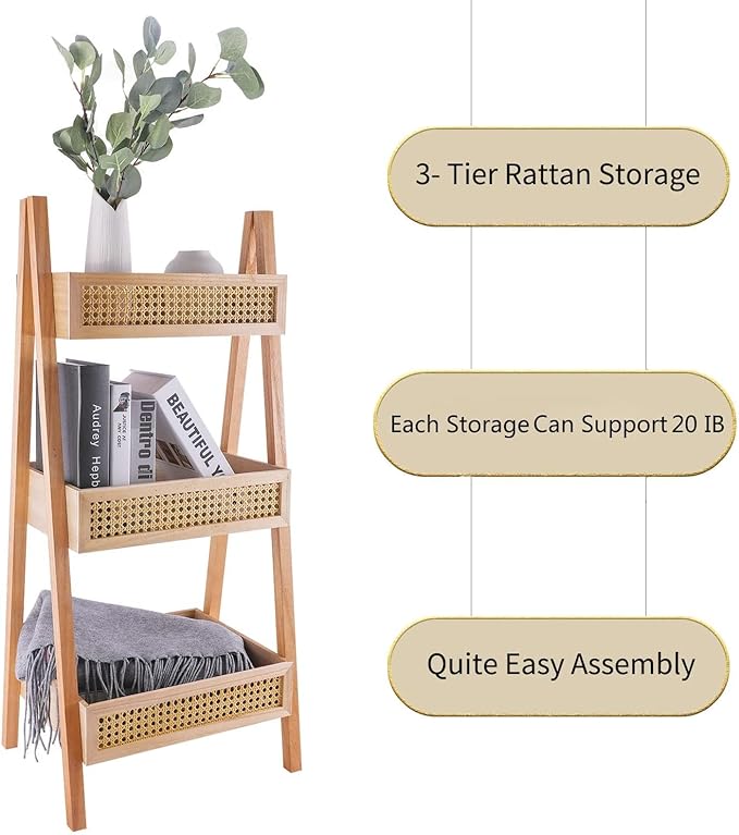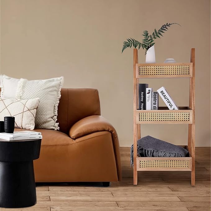ZYBT Ladder Bookshelf, 3-Tier Rattan Bookshelf, Free Standing Bookcase, Blanket Ladder, Wood Organizer Storage Shelves for Living Room Bedroom Kitchen Bathroom Balcony and Home Office