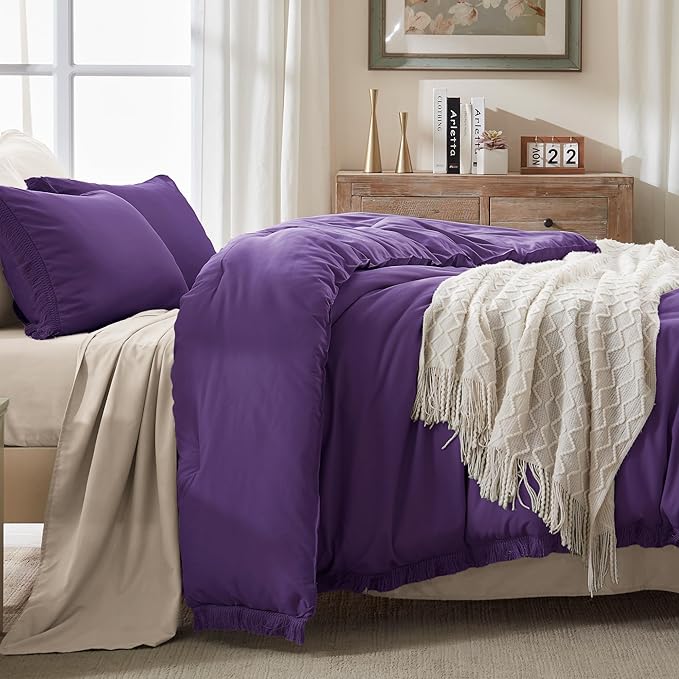 Andency Purple Comforter Set Full, 3 Pieces Boho Tassel Lightweight Bedding Comforter Sets, All Season Soft Fluffy Fringe Bed Set (79x90In Comforter & 2 Pillowcases)
