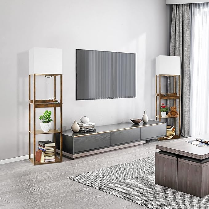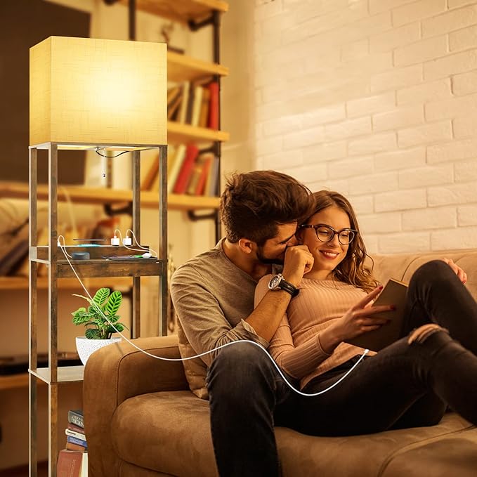 RUNTOP Floor Lamp with Shelves, Plus Shelf Lamp with Wireless Charger, 2 USB Port and Outlet, 1 Drawer, 15W LED Bulb, 3 Colors, Memory Function, Floor Lamps for Living Room, Standing Lamp for Bedroom