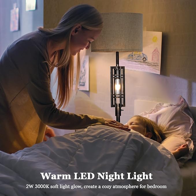 SURAIELEC Farmhouse Floor Lamp with LED Nightlight Bulb, Rustic Tall Lamps for Cabin, Traditional Standing Lamps for Bedroom, Beige Linen Drum Shade, Oil Rubbed Bronze Finish, Foot Switch