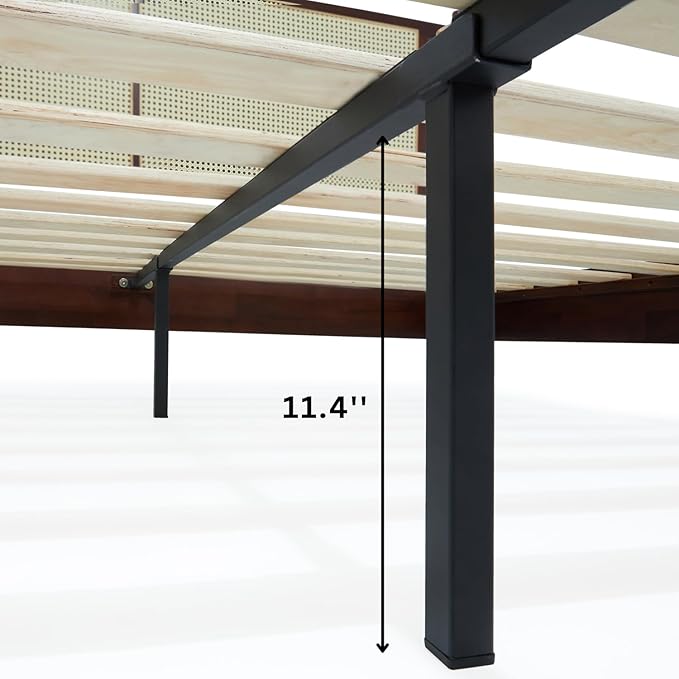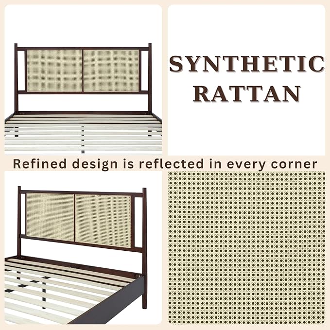 Bme Oliver King Bed Frame and Headboard - 15-Inch Signature Design with Rattan Headboard, Bohemian and Mid Century Style, 12-Slat Wood Support, No Box Spring Needed - Easy Assembly, Walnut