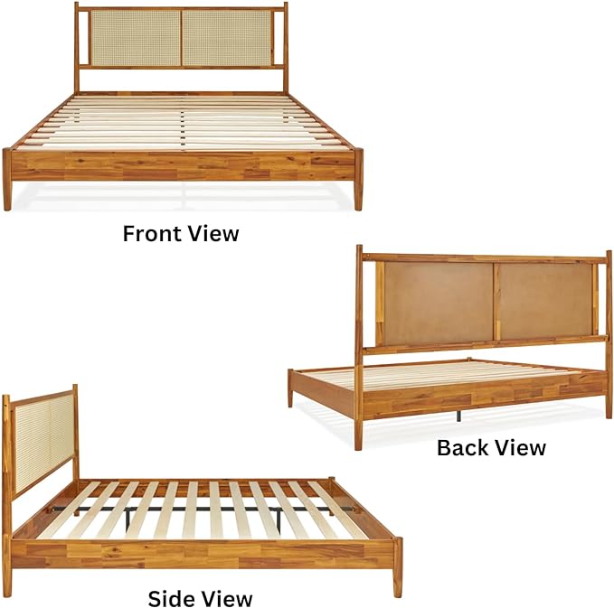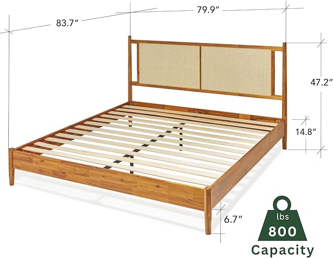 Bme Oliver King Bed Frame and Headboard - 15-Inch Signature Design with Rattan Headboard, Bohemian and Mid Century Style, 12-Slat Wood Support, No Box Spring Needed - Easy Assembly, Caramel