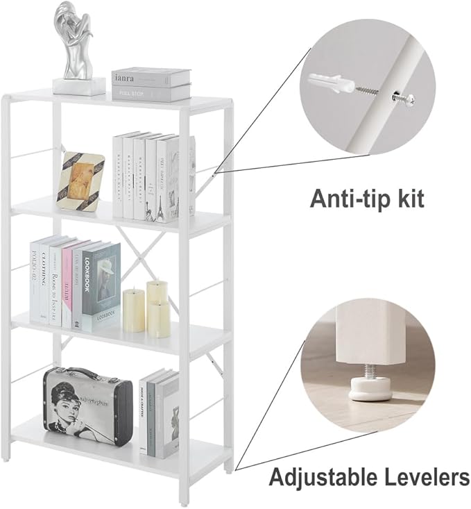 Rustic Bookshelf and Bookcase, Industrial Metal and Wood Book Shelves, 4-tier Shelving Unit for Living Room Bedroom, White Oak
