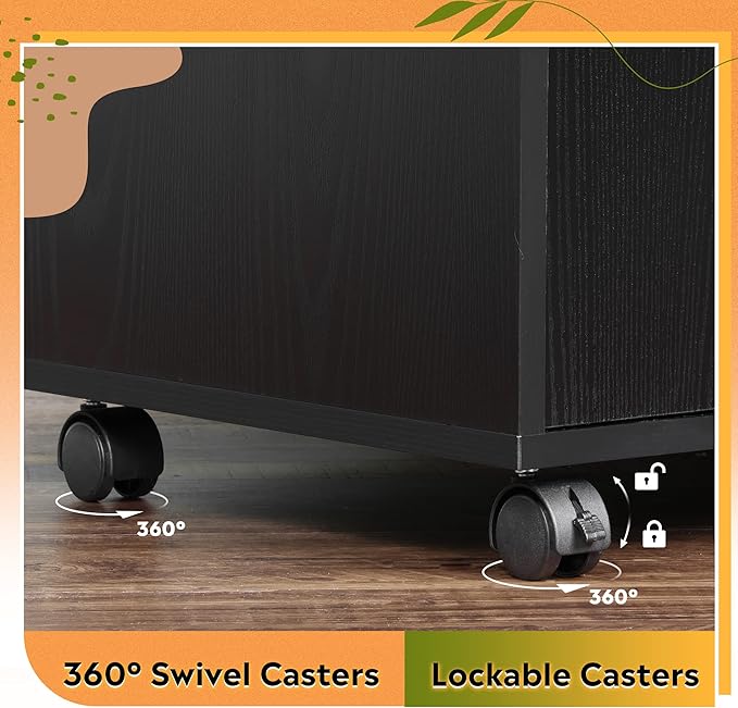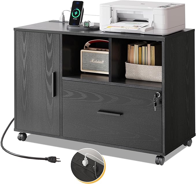DEVAISE File Cabinet with Charging Station, 1-Drawer Lateral File Cabinets with lock for home office, Wooden Rolling Printer Stand with Shelves, Black