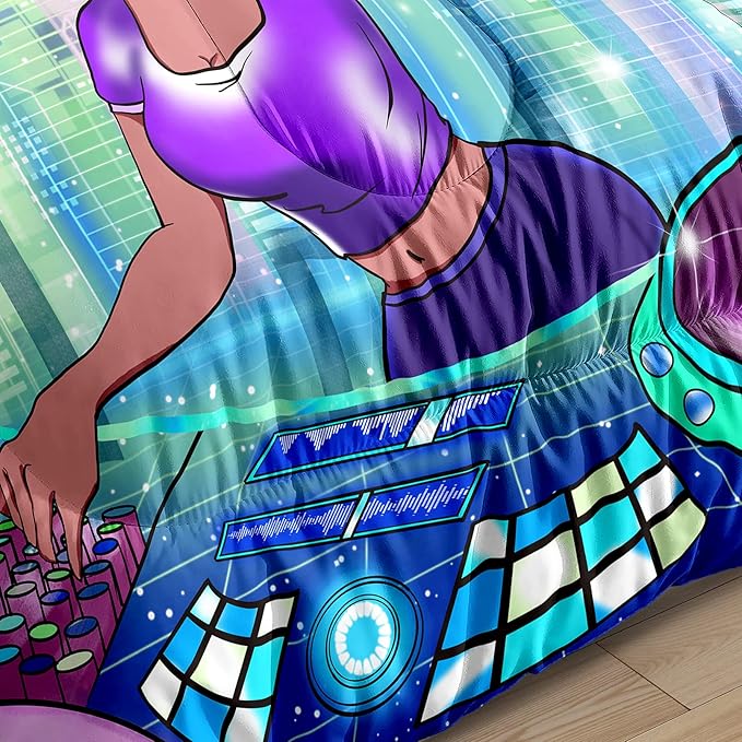 African American Comforter Sets for Girls, Full Size Comforter Set for Girls with Cool DJ Girl Pattern Soft Microfiber 3 Piece Quilt Set Green Pretty Girl Bedding Comforter Set with 2 Pillowcases