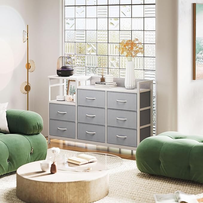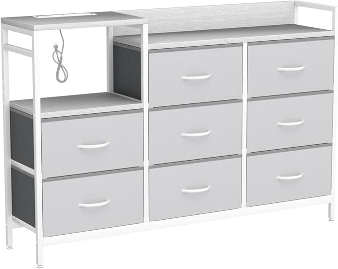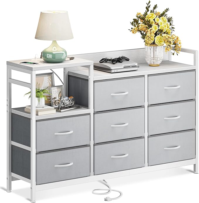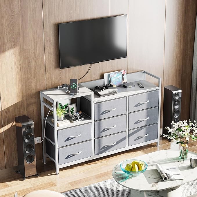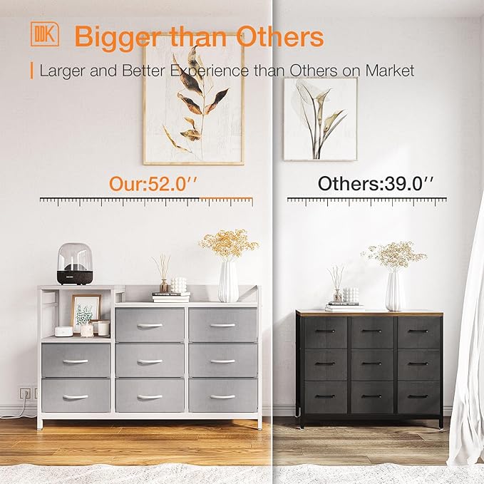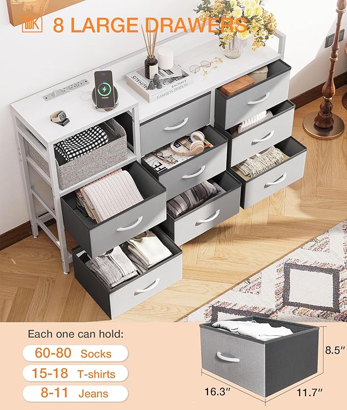 ODK Dresser with Charging Station, 52-Inch Long Dresser TV Stand for Bedroom, Large Dresser with 8 Storage Drawers, Chest of Drawers Easy-Pull Fabric Dressers for Living Room, White and Light Grey