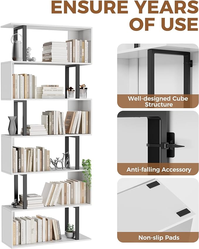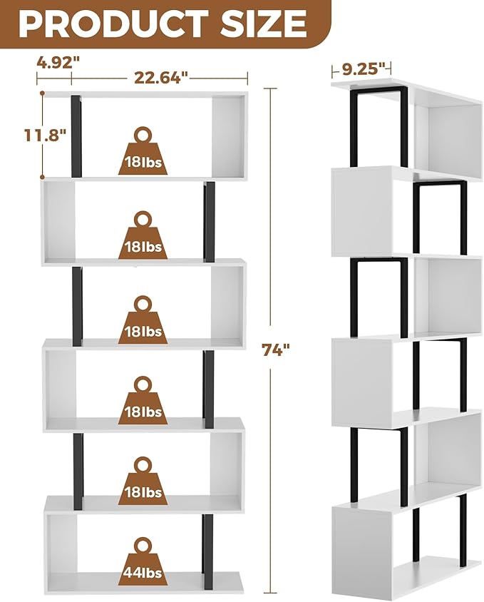 About This 【5/6-tier S-shaped Bookcase】Perfect for organizing books, magazines, plants and other items in a neat and stylish manner. 【Durable...