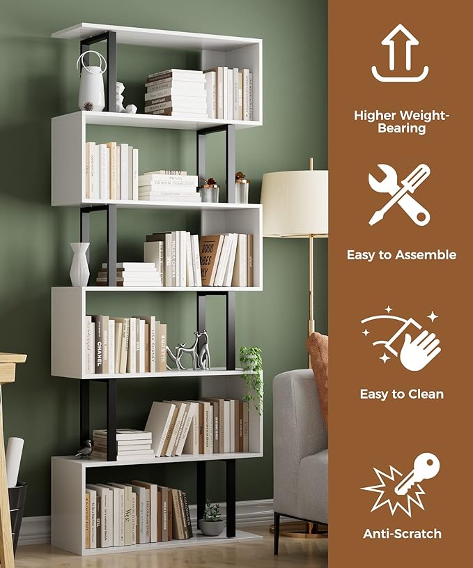 Gadroad 6 Tier Geometric Bookcase,S Shaped Bookshelf, Wood Decorative Storage Shelving, Modern Freestanding Display Shelves, Tall Book Shelf Unit for Living Room Bedroom, White