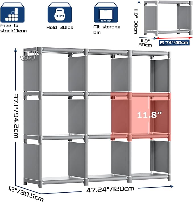 Mavivegue Book Shelf, 9 Cube Storage Organizer, DIY Bookcase, Metal Cube Bookshelf, Tall Book case for Bedroom, Living Room, Office, Closet Storage Organizer, Grey Cubicle Storage Rack