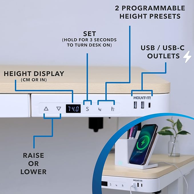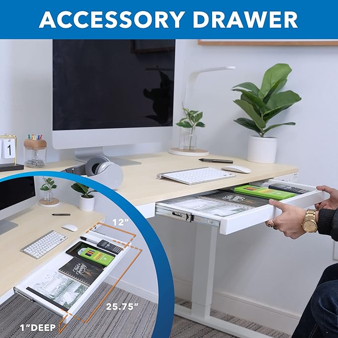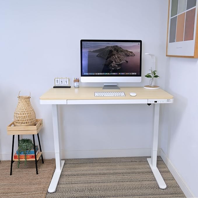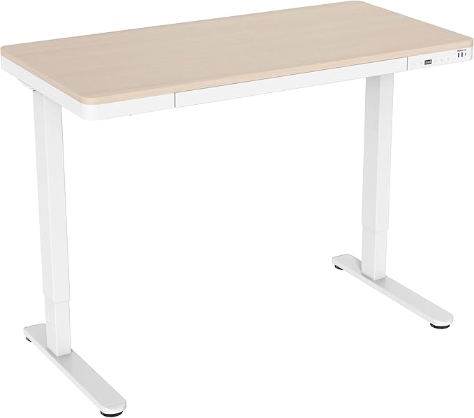 Mount-It! 47.2" Wide x 28.3" Deep Electric Height Adjustable Desk, Ergonomic Standing Workspace, Height Adjustment up to 46.5" Tall, Large Desktop, USB Ports, Drawer, Home Office, White, Maple Top