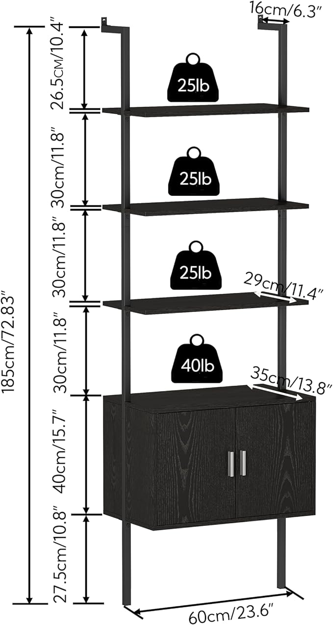 Yusong 73" Tall Bookshelf with Cabinet, Industrial Ladder Wall Mount Shelf Bookcase with Wood and Metal Frame, Plant Shelf Wall Storage Display for Living Room Bedroom, Black Wood Grain