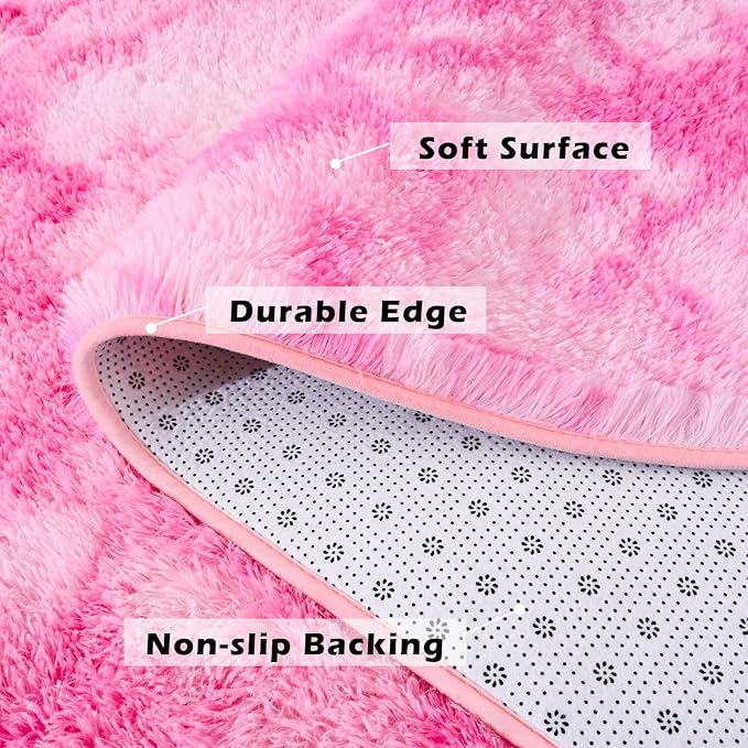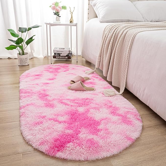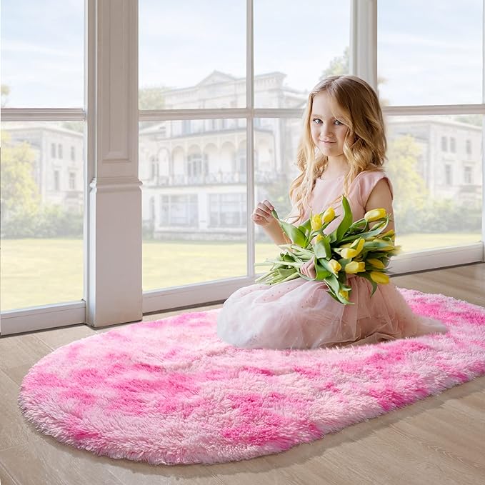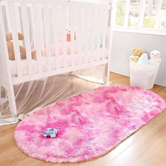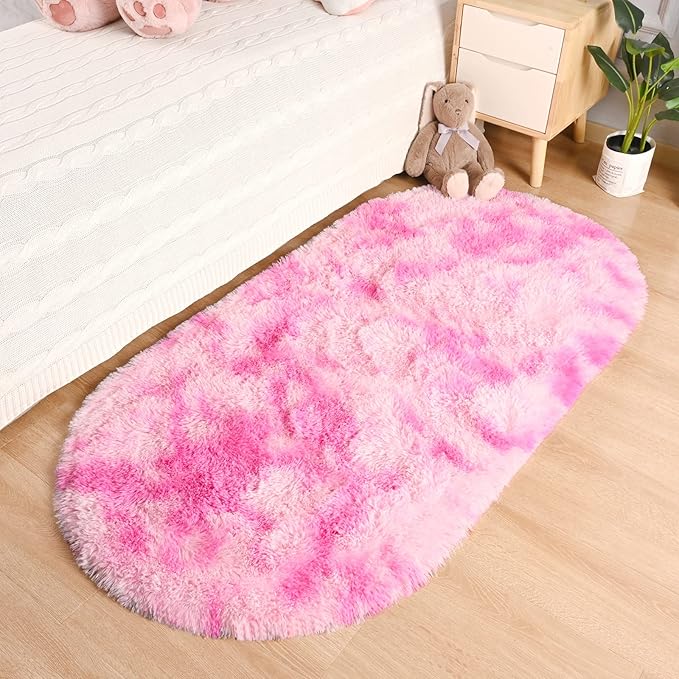 Merelax Soft Shaggy Rug for Kids Bedroom, Oval 2.6'x5.3' Plush Fluffy Rugs for Living Room, Furry Carpet for Teen Girls Room, Anti-Skid Fuzzy Comfy Rug for Nursery, Cute Baby Play Mat,Tie-dyed Pink