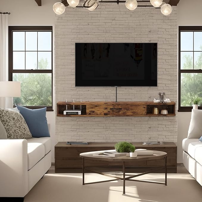 Floating TV Unit, 55'' Wall Mounted TV Cabinet, Floating Shelves with Door, Modern Entertainment Media Console Center Large Storage TV Bench for Living Room & Office (55.12IN, Rustic Brown)