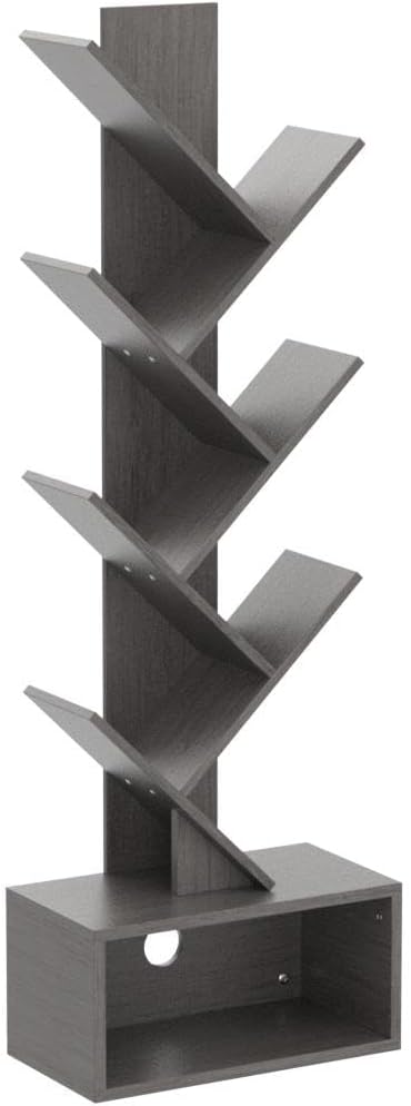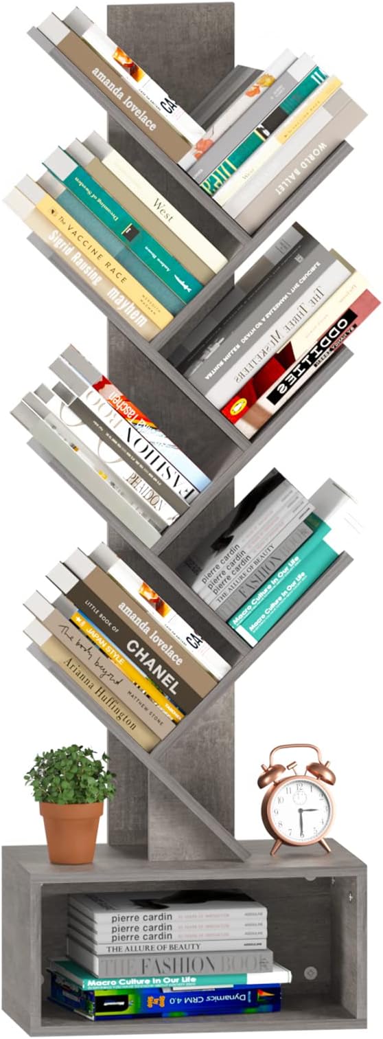 Yoobure Tree Bookshelf - 6 Shelf Retro Floor Standing Bookcase, Tall Wood Book Storage Rack for CDs/Movies/Books, Utility Book Organizer Shelves for Bedroom, Living Room, Home Office, Grey